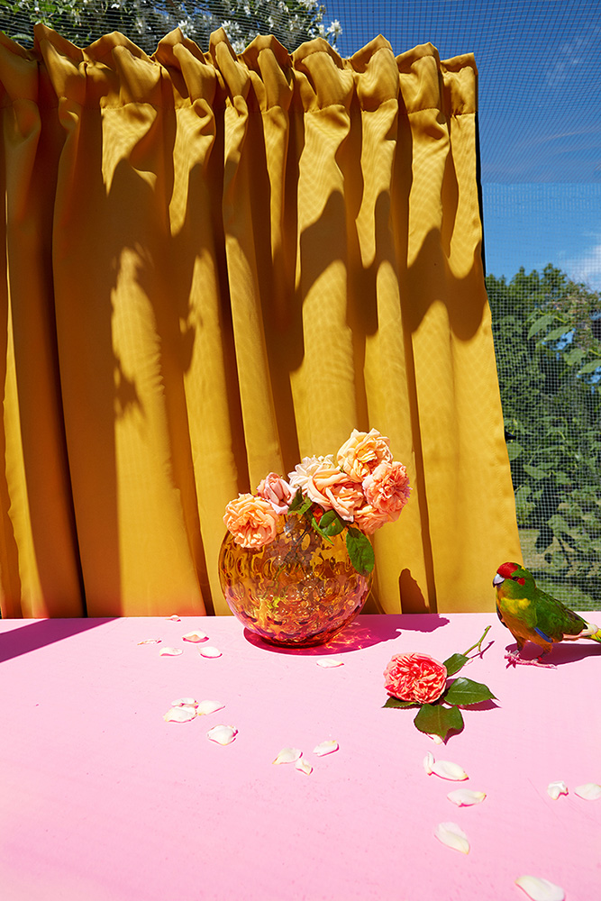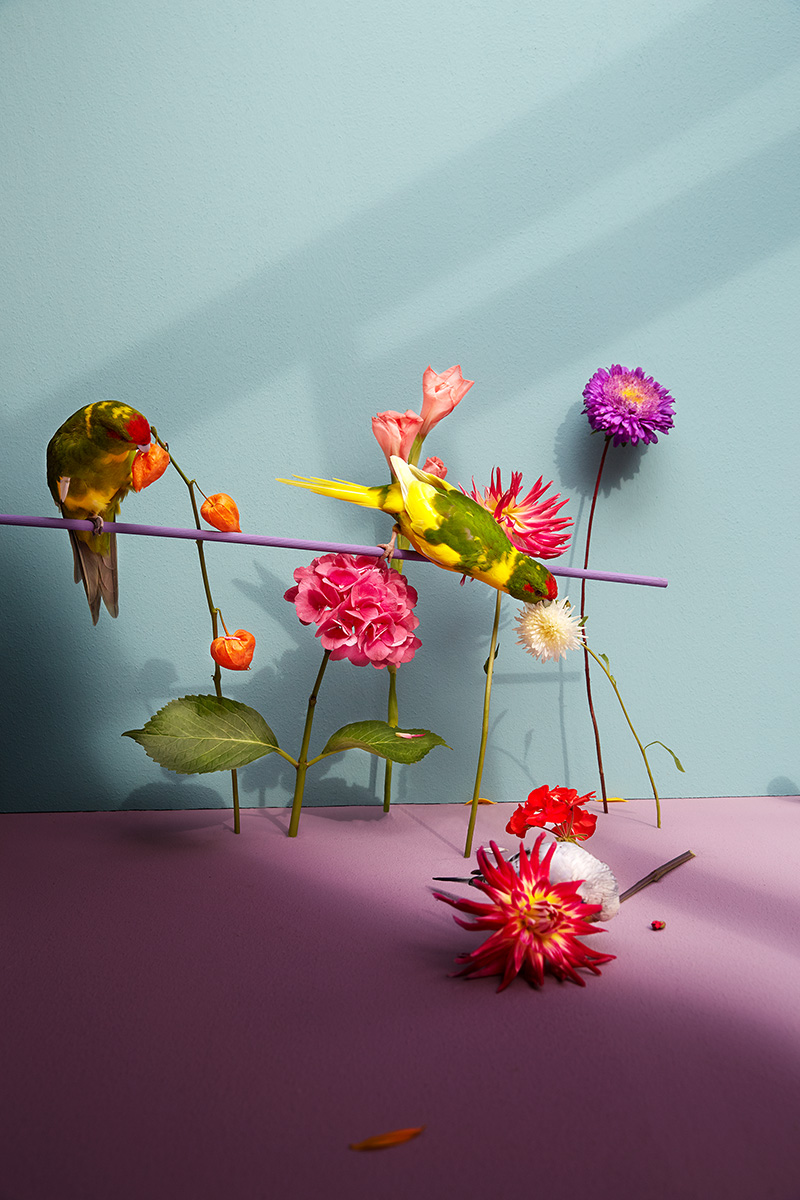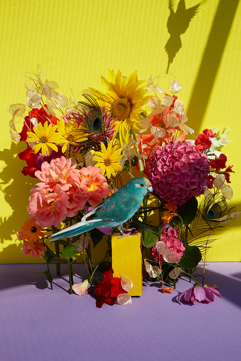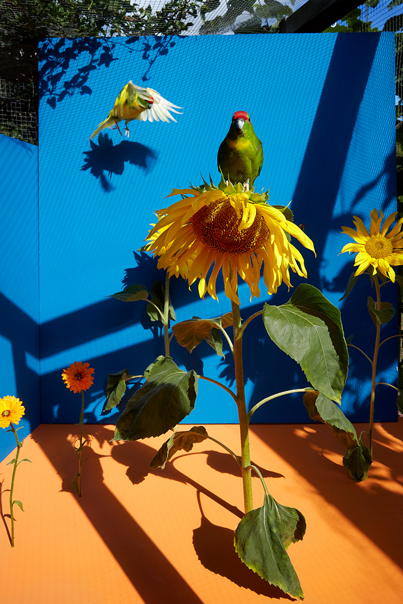 In Summertime, I try to return a fragment of that lost world. Each summer, I bring flowers from my garden into their aviary. For some, it may be their very first encounter with a flower: its smell, its color, its taste. These quiet moments become encounters between captivity and memory, between what was and what might have been.